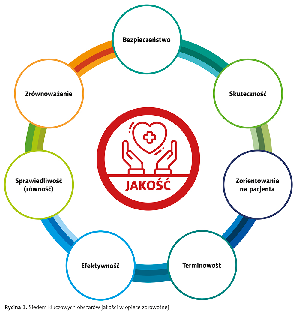 W literaturze oraz w rekomendacjach WHO, OECD, Institute of Medicine i HSE przyjmuje się siedem kluczowych obszarów jakości w opiece zdrowotnej, które stanowią uniwersalne kryteria oceny i doskonalenia systemów ochrony zdrowia (ryc. 1).
