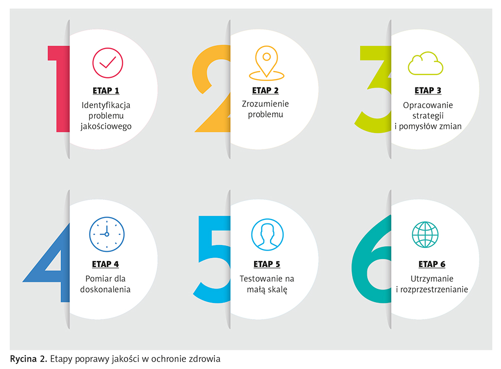 Kluczowe elementy jakości w opiece zdrowotnej wyznaczają ramy, w których organizacje ochrony zdrowia mogą systematycznie doskonalić swoje działania, a ich realizacja ma bezpośrednie przełożenie na poziom świadczonych usług. Wszystkie te obszary funkcjonu ją w pełnej harmonii, a ich zaniedbanie w chociażby jednym wymiarze może osłabiać efekty w innych. Co więcej, uwzględnienie ich w praktyce zarządczej i klinicznej prowadzi do synergicznej poprawy jakości zarówno w konkretnym szpitalu, jak i w całym systemie ochrony zdrowia. Ich integracja umożliwia nie tylko zwiększenie bezpieczeństwa i skuteczności interwencji medycznych, lecz także wzmocnienie legitymizacji społecznej systemu oraz jego długofalowej stabilności. Tym samym znajomość wymienionych obszarów pozwala menedżerom zdrowia lepiej identyfikować priorytety i kierować inicjatywami w stronę najistotniejszych aspektów jakości. Aby przejść od diagnozy do wdrożenia skutecznych rozwiązań, pomocne okazuje się systemowe podejście, które przedstawiono na rycinie 2.