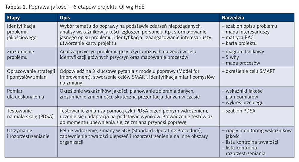 Niniejsze wprowadzenie w temat QI rozpoczyna cykl artykułów, w których szczegółowo opisywane będą poszczególne etapy działań projakościowych wraz z przedstawieniem skutecznych i przetestowanych w Polsce i za granicą narzędzi do ich realizacji. Dodatkowo przytoczone zostaną przykłady z polskich szpitali oraz cytowania z publikacji zagranicznych przedstawiających blaski i cienie QI na podstawie realnych realizacji w szpitalach. Znajomość narzędzi do wdrażania poprawy jakości jest niezbędna dla kadry zarządzającej szpitalami, wyjątkowo istotna ze względu na możliwość szybkiego uzyskania wartościowej dla organizacji zmiany w odniesieniu do zaobserwowanych problemów, a dodatkowo stanowi element wymagany do autoryzacji zgodnie z ustawą o jakości w opiece zdrowotnej. Idea powstania niniejszego cyklu inspirowana była publikacją irlandzkiego odpowiednika NFZ – organizacji HSE (Health Service1). HSE była wielokrotnie przedmiotem krytyki, często przedstawiana w mediach irlandzkich jako organizacja nieefektywna, scentralizowana i nadmiernie zbiurokratyzowana oraz związana z wieloma nieprawidłowościami zarówno z zakresu opieki medycznej, jak i ochrony danych osobowych. W odpowiedzi na potrzebę zwiększenia przejrzystości i wzmocnienia komunikacji z pacjentami HSE wprowadziło znaczące zmiany w dotychczasowej polityce zdrowotnej (HSE Open Disclosure Policy), w tym praktyczny przewodnik HSE Quality Guide and Toolkit2.
