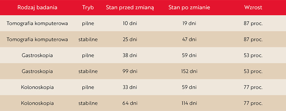 Skutkiem ograniczenia podaży świadczeń diagnostycznych jest bezpośrednie wydłużenie czasu oczekiwania na badania. W sytuacji gdy możliwości wykonawcze pracowni pozostają niezmienione (sprzęt, kadra), a jedynym czynnikiem ograniczającym staje się poziom finansowania, dochodzi do niewykorzystania istniejącego potencjału systemu. Jednocześnie pacjenci, którzy mogliby zostać zdiagnozowani szybciej, są zmuszeni do oczekiwania na wolne terminy.