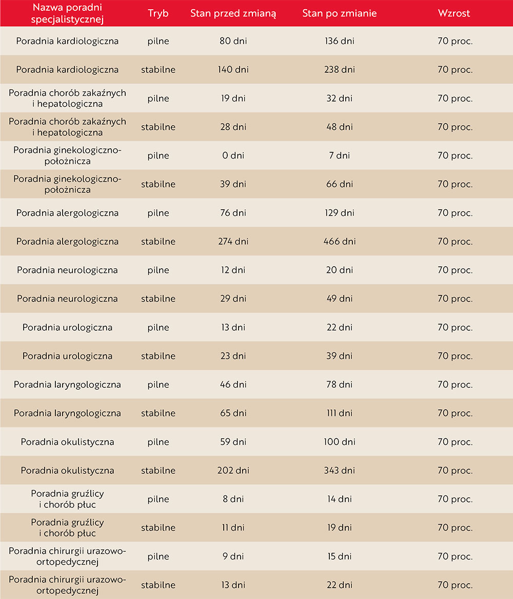 Tabela 2. Średni czas oczekiwania do poradni specjalistycznych – dane na 19 marca 2026 r. i po wprowadzeniu planowanego rozwiązania (opracowanie własne)