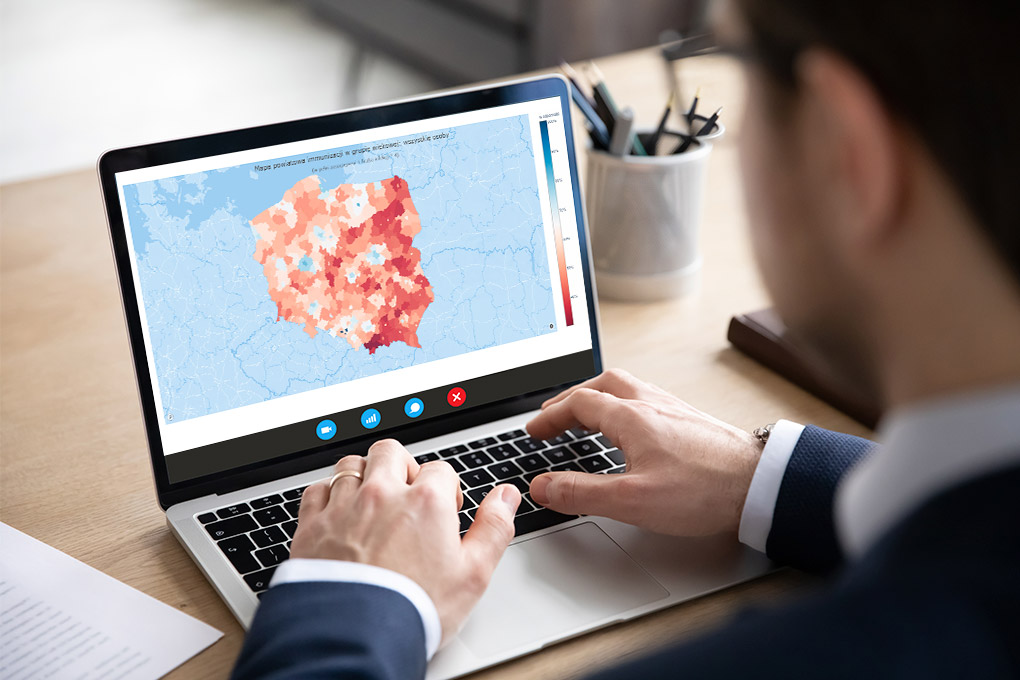 „Menedżer Zdrowia” udostępnia link do interaktywnej mapy, na której pokazany jest wskaźnik odporności na COVID-19 w powiatach, liczony na podstawie populacji, liczby w pełni zaszczepionych oraz zarejestrowanych infekcji razy pięć.