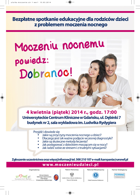 „Moczeniu nocnemu powiedz: Dobranoc!” – pod takim hasłem 4 kwietnia 2014 r. o 17.00 w Uniwersyteckim Centrum Klinicznym w Gdańsku przy ulicy Dębinki 7 (budynek nr 2, sala wykładowa im. Ludwika Rydygiera) odbędzie się bezpłatne spotkanie edukacyjne dla rodziców dzieci z problemem moczenia nocnego.