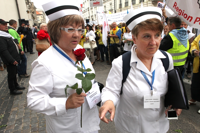 - Konieczne jest przerwanie fikcyjnego udawania, że państwo pokrywa w sposób należyty świadczenia usług medycznych, gdy w rzeczywistości limituje świadczeniodawcom ilość kontraktowanych procedur, a pacjent w praktyce musi zmierzyć się z problemem wielomiesięcznego czekania w kolejce na realizację świadczeń. Państwo nakazuje świadczeniodawcom wykonywanie na swój koszt procedury medyczne ratujące zdrowie i życie, także te poza zawartym kontraktem, a później wymusza na nich zrzeczenia się znacznej części wykonywanych świadczeń w ramach ugody. Nie ma też woli i państwo nie widzi konieczności zapewnienia przez jednostki ochrony zdrowia gwarantowanej liczby pielęgniarek i położnych. Brak ujęcia naszej grupy zawodowej w systemie kontraktowania świadczeń medycznych powoduje, że pierwszą i najłatwiejszą oszczędnością jest ograniczenie liczby zatrudnionych pielęgniarek i położnych. Liczba pielęgniarek po 65. roku życia jest większa niż tych w wieku 25 lat. Na naszych ulotkach, żeby ludzie widzieli, jak wygląda problem, będą przedstawione dane, że młodych pielęgniarek i położnych jest 5462, a powyżej 65. roku życia - 8700 - mówiła nam w kwietniu Lucyna Dargiewicz.