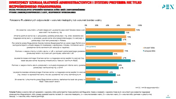 Z badania firmy analitycznej PEX opartego o ankiety przeprowadzone wśród 12 kluczowych firm farmaceutycznych w Polsce, wynika że najbardziej potrzebnym wsparciem do tego, aby producenci leków zainwestowali w produkcję leków w Polsce, obok stworzenia warunków uzyskania zezwoleń środowiskowych i na budowę, jest zmiana polityki cenowej w przypadku polskiej produkcji.