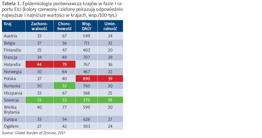 W tabeli 1 przedstawiono szacunkowe dane za 2017 r. dotyczące standaryzowanej pod względem wieku zapadalności na raka płuca, częstotliwości występowania i lat życia skorygowanych o niepełnosprawność8. Współczynnik zachorowalności jest liczbą nowych przypadków raka płuca w danym roku. Chorobowość to liczba przypadków raka płuca, które są obecne w ogólnej liczbie ludności danego kraju w danym roku. Szwecja ma najniższy wskaźnik zachorowalności, najniższy wskaźnik chorobowości (ex aequo z Rumunią), najniższy współczynnik DALY i najniższą śmiertelność. Holandia ma najwyższy wskaźnik zachorowalności i chorobowości, podczas gdy Polska ma najwyższy współczynnik DALY i najwyższy wskaźnik umieralności.
