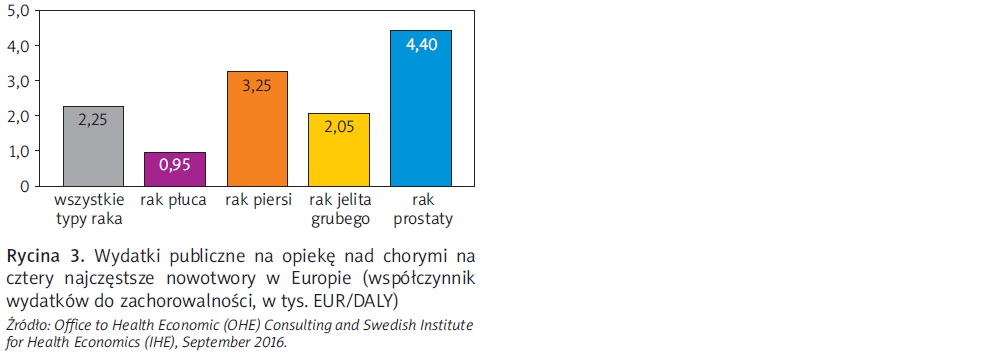 Szacuje się, że choroby nowotworowe w Europie kosztują ok. 126 mld EUR (140 mld USD) rocznie, z czego 52 mld EUR stanowią koszty związane z utratą produktywności4. Wraz z postępem w opiece zdrowotnej wydłuża się średnia długość życia, a liczebność i wiek populacji rośnie, w związku z tym koszty również5. Rak płuca stanowi większe obciążenie ekonomiczne (obliczone jako suma kosztów bezpośrednich opieki zdrowotnej i kosztów pośrednich, takich jak utrata produktywności) niż rak piersi, jelita grubego i prostaty. W 2009 r. rak płuca pochłonął 15 proc. całkowitych kosztów leczenia nowotworów w Europie, czyli równowartość 18,8 mld USD6. Chociaż koszt leczenia chorych na raka płuca jest wysoki, to jest to obszar nadal relatywnie niedofinansowany. Odsetek wydatków publicznych na leczenie poszczególnych nowotworów nie jest proporcjonalny do generowanego przez nie obciążenia7. Podczas gdy ok. 5 proc. wydatków na zdrowie jest przeznaczonych na leczenie nowotworów, to istnieją znaczące różnice w alokacji środków na poszczególne rodzaje nowotworów4. Wydatki na raka płuca w Europie są znacznie niższe niż na raka piersi, jelita grubego lub prostaty (ryc. 3)4. Nie ma jednak pewności, dlaczego tak się dzieje. Być może wynika to z braku programów badań przesiewowych w kierunku raka płuca, które są dość kosztowne. Wytłumaczeniem może być również piętno choroby i stygmatyzacja chorych.