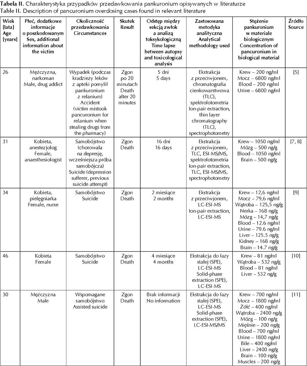 Pankuronium jest aminosteroidem podawanym jako dibromek w dawkach: przy intubacji – 0,08 do 0,10 mg/kg, a przy wstępnej kuraryzacji – 0,01 do 0,02 mg/kg 1. Jego stężenie terapeutyczne zawiera się w granicach 200–600 ng/ml 6. Stężenia stwierdzane w przypadkach przedawkowania wraz z ich krótką charakterystyką zebrano w tabeli II 5–11.