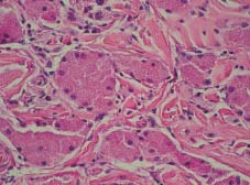 Guz ziarnistokomórkowy (granular cell tumour – GCT), zwany inaczej guzem Abrikosowa, jest rzadkim nowotworem wywodzącym się z neuroektodermy. Częstość występowania GCT szacuje się na ok. 0,019–0,03% wszystkich nowotworów. Pojawia się on najczęściej między 40. a 60. rokiem życia, częściej u kobiet i osób rasy czarnej. Opisywano występowanie GCT praktycznie w każdej okolicy ciała, jednak najczęstszą lokalizacją, stanowiącą ponad połowę przypadków, są tkanki miękkie głowy i szyi. W zdecydowanej większości przypadków guz występuje w postaci łagodnej. Autorzy przedstawiają niezwykle rzadki przypadek GCT zlokalizowanego na mięśniu brzuchatym łydki. Obraz mikroskopowy komórek z obfitą kwasochłonną cytoplazmą i zawartością licznych ziarnistości oraz dodatni wynik badania immunohistochemicznego w kierunku białka S-100 potwierdziły rozpoznanie GCT opisanego przypadku. W 8 miesięcy po radykalnym usunięciu zmiany nie obserwuje się cech wznowy miejscowej.