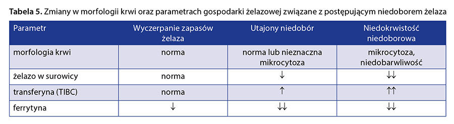 W tabeli 5 przedstawiono zmiany w morfologii krwi oraz parametrach gospodarki żelazowej związane z postępującym niedoborem żelaza, a w tabeli 6 różnicowanie między IDA i ACD.