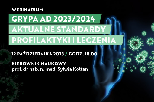 Zapraszamy na webinar „Grypa AD 2023/2024. Aktualne standardy profilaktyki i leczenia”, który odbędzie się 12 października o godz. 18.00. Kierownikiem naukowym spotkania jest prof. dr hab. n. med. Sylwia Kołtan.