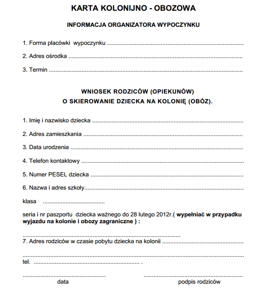 -To nie jest prawda - wyjaśnia ekspert Porozumienia Zielonogórskiego Joanna Szeląg. - Kwestię tę reguluje Rozporządzenie Ministra Edukacji Narodowej z dnia 30 marca 2016 r. w sprawie wypoczynku dzieci i młodzieży (Dz.U. z 2016 r., poz. 452). Jednym z jego załączników jest karta kwalifikacyjna uczestnika wypoczynku. W tym druku znajdują się wprawdzie informacje dotyczące stanu zdrowia dziecka (np. na co uczestnik jest uczulony, jak znosi jazdę samochodem, czy przyjmuje stale leki i w jakich dawkach, czy nosi aparat ortodontyczny lub okulary, na co był szczepiony), ale podpisuje się pod nimi rodzic lub sam uczestnik, jeśli jest pełnoletni.
