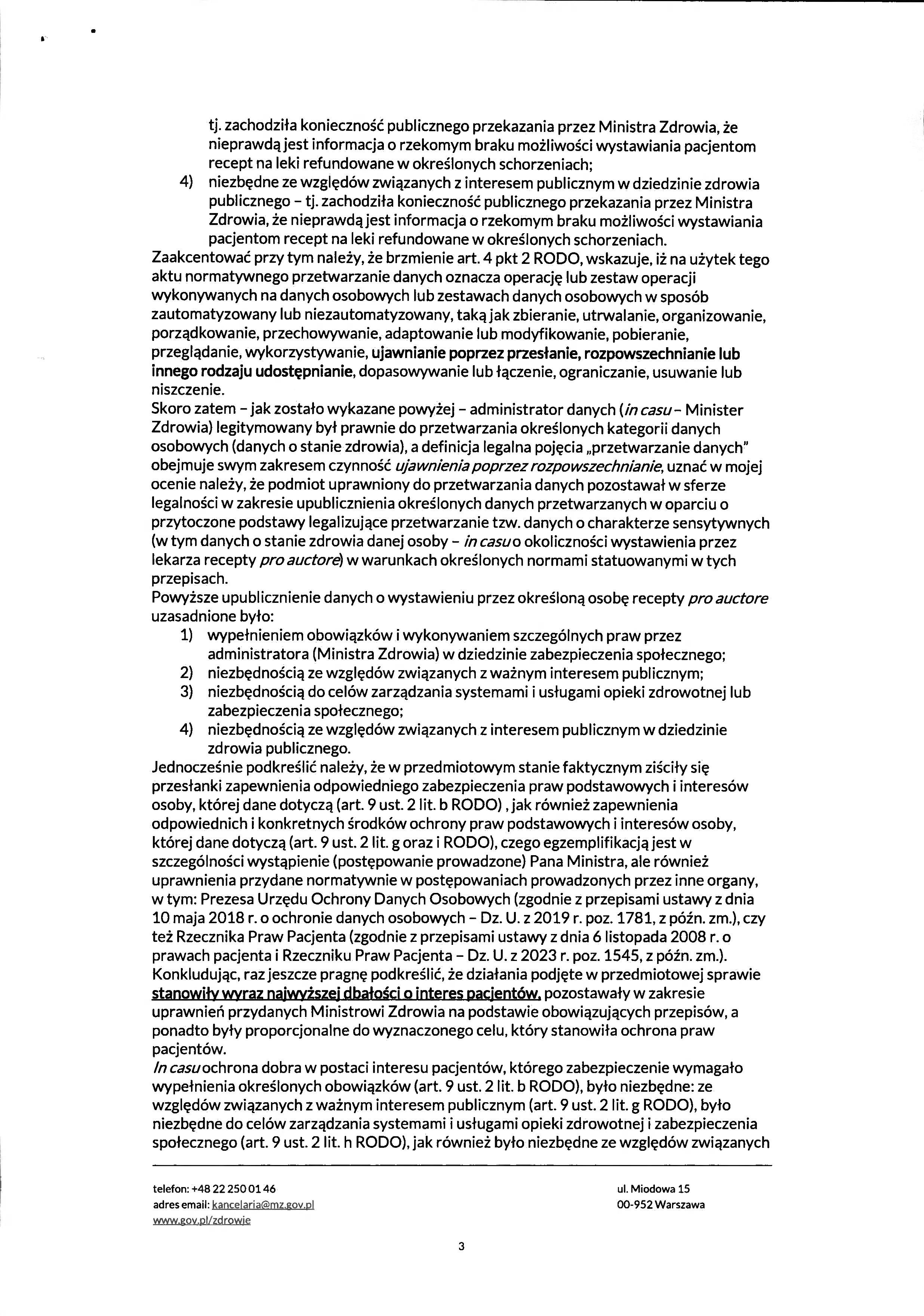 "Nie dokonując pogłębionej analizy uprawnień ministra zdrowia przysługujących temu organowi na podstawie przepisów działu VII ustawy o świadczeniach, stwierdzić należy, że podmiot ten jest normatywnie legitymowany do przetwarzania wszelkich danych gromadzonych w Elektronicznej Platformie Gromadzenia, Analizy i Udostępnienia Zasobów Cyfrowych o Zdarzeniach Medycznych w celu sprawowania nadzoru nad ubezpieczeniem zdrowotnym w zakresie określonym w dziale VII ustawy o świadczeniach. Bezdyskusyjna prawnie jest zatem przesłanka legalizująca przetwarzanie ww. danych przez ministra zdrowia – w zakresie realizacji przez ten organ określonych normatywnie zadań, w których bez wątpienia zawiera się weryfikacja możliwości (dostępności) korzystania przez pacjentów (świadczeniobiorców w rozumieniu przepisów ustawy o świadczeniach) z leków objętych refundacją ze środków pozostających w dyspozycji Narodowego Funduszu Zdrowia" – przypomniał.