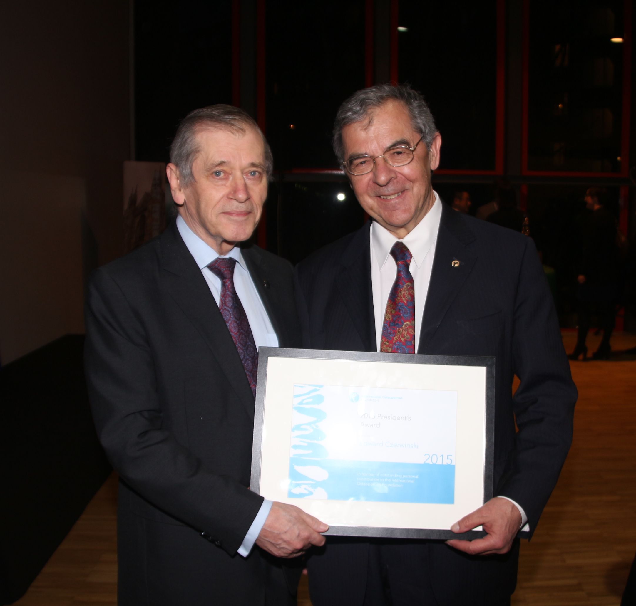 Z przyjemnością informujemy o uhonorowaniu prestiżową nagrodą International Osteoporosis Foundation profesora Edwarda Czerwińskiego za nadzwyczajne zasługi w Europie Środkowej. Nagrodę wręczono podczas World Congress of Osteoporosis w Mediolanie. Profesor Czerwiński został wyróżniony przez prezydenta International Osteoporosis Foundation - profesora Kanisa nagrodą za wybitne zasługi w Europie Środkowej. Nagroda jest przyznawana corocznie przedstawicielom z różnych kontynentów za wybitne osiągnięcia w zakresie osteoporozy i chorób mięśniowo-szkieletowych. Profesor Edward Czerwiński jest pierwszą osobą wyróżnioną z Polski i z naszej części Europy.