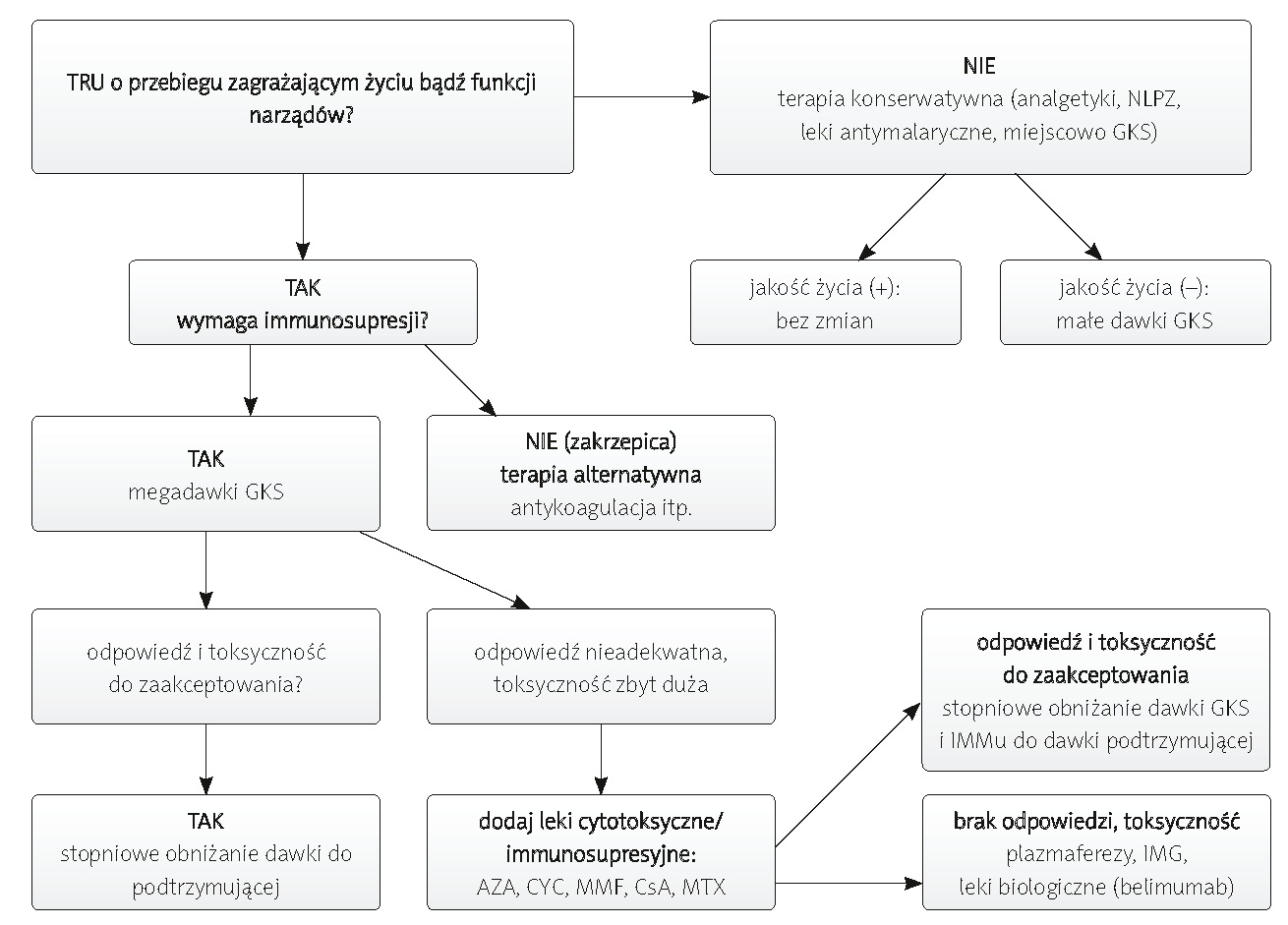 W opracowaniu w zarysie, na podstawie aktualnych danych literaturowych i praktyki klinicznej, przedstawiono proces diagnostyczny oraz badania konieczne do wykonania przy ustalaniu rozpoznania tocznia rumieniowatego układowego (TRU). Na podstawie danych zawartych w piśmiennictwie, z uwzględnieniem polskich realiów, zaproponowano algorytm postępowania terapeutycznego dostosowany do różnego przebiegu klinicznego choroby (ryc. 1, tab. I–III).
